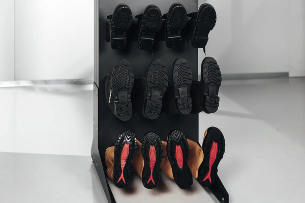 Asciugare correttamente gli stivali da lavoro e le calzature protettive è essenziale per mantenere la loro qualità, le caratteristiche di sicurezza e garantire il comfort del portatore. Quando gli stivali e le scarpe di sicurezza non vengono asciugati rapidamente e immediatamente, possono sviluppare odori sgradevoli e ospitare batteri. Rimanere bagnati troppo a lungo può anche influire sul materiale della scarpa, poiché l'umidità lo indebolisce, riducendo significativamente la durata. Lavare le scarpe e gli stivali in lavatrice troppo frequentemente per rimuovere gli odori influisce anche sulla loro durata a causa dell'attrito durante i cicli di lavaggio e dei prodotti chimici e detergenti utilizzati. Il lavaggio non è la soluzione adeguata per il bisogno quotidiano di scarpe da lavoro asciutte, disinfettate e prive di odori.