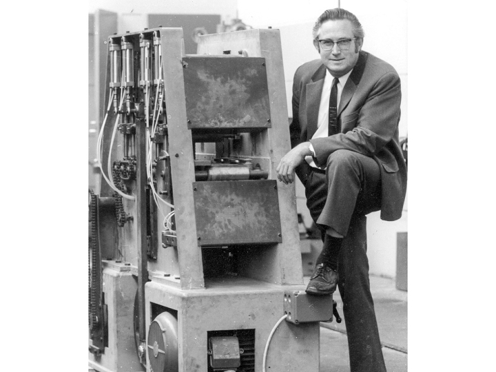 In 1970, Hans Wintersteiger developed the world's first frame saw for thin-cutting. It was used by Fischer Ski for manufacturing skis, whereby laminated strips – the "ski cores" inside the skis – were cut from ash. The thin-cutting frame saw was a true innovation. Until then, sawmills only had large frame saws. Hans Wintersteiger derived his small thin-cutting system from these large sawing machines.
