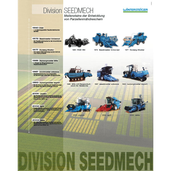 Another milestone on the way to becoming the world market leader was the development of the large combine "Seedmaster Advance". WINTERSTEIGER solved the demand for plot combines with more power in 1987 with a conventional combine, where a standard Deutz-Fahr M660 was converted into a plot combine with a cutting width of 2.25 m. WINTERSTEIGER subsequently switched to a Sampo basic machine and the combines are today converted by New Holland. The Split NH dual plot combine is being successfully deployed in markets with very large trial plots in particular, such as the USA and Brazil, as well as for harvesting corn.