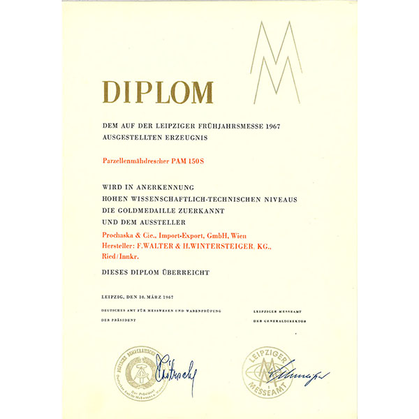 Around 15 combines of the PAM 150 model were built each year. It was a narrow combine with a cutting width of 150 cm. At the Leipzig Spring Fair in 1967, F.Walter & H. Wintersteiger KG received the gold medal for the "high scientific-technical" level of the PAM 150S, and of the PAM125 model in 1971.