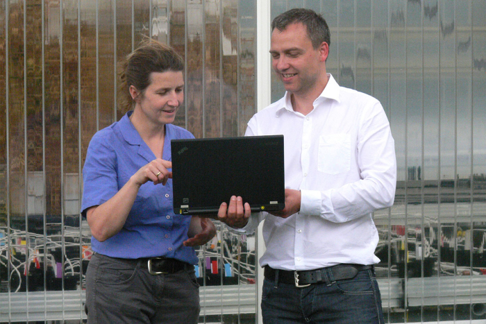 Software developers Rico Basekow and Svenja Diehl at the Klein-Altendorf test site at the University of Bonn (2014)