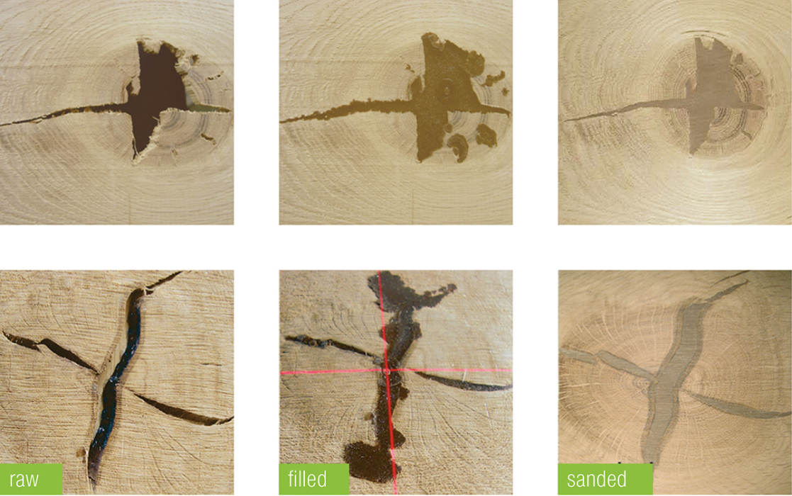 双重处理可以用两种颜色对一块地板进行修复。操作员根据木材的类型选择较浅和较深的颜色。操作员手动限定缺陷点。为此,机器集成有一个激光十字架,向操作者指示该注射点。